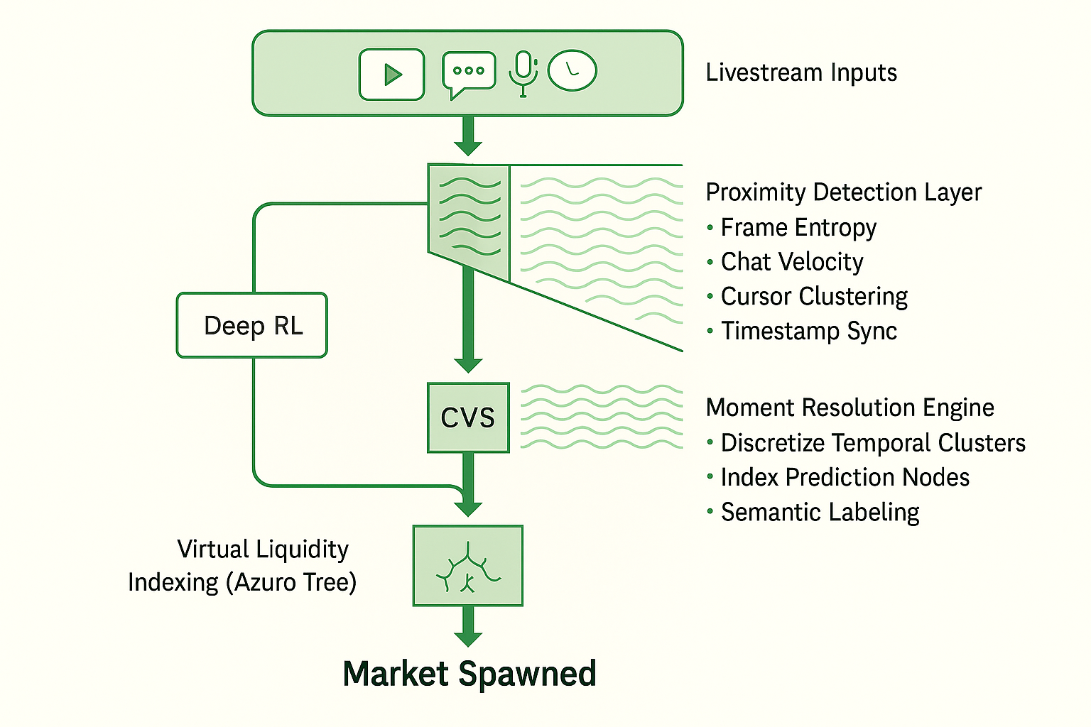 Market instantiation occurs via Azuro's Virtual Liquidity Tree model. This allows each predictive moment to be instantiated as a market node with inherited capital depth.